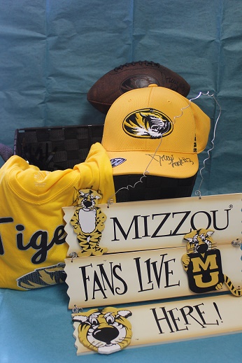 This basket includes an autographed Mizzou football, Mizzou ladies top (size medium), hat, and family plaque.
